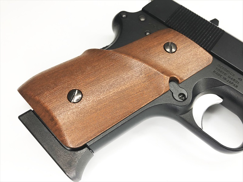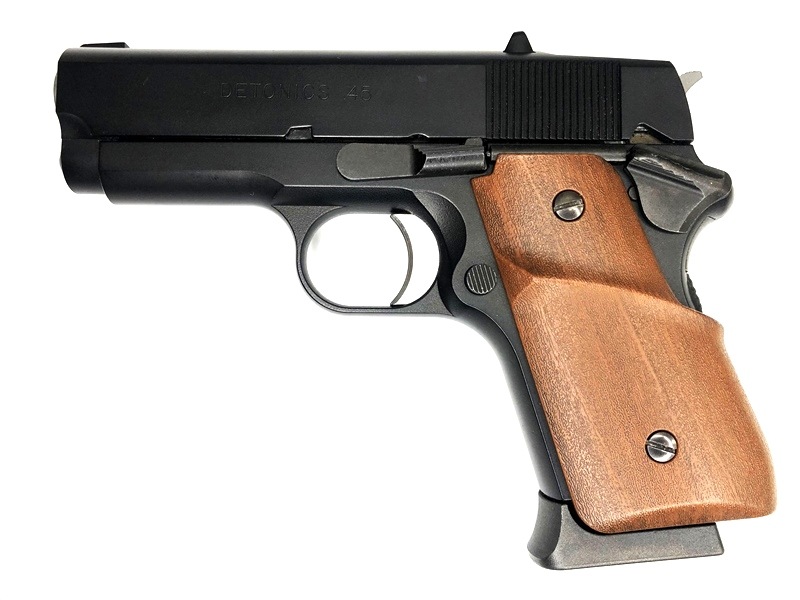 デトニクス.45のモデルとなったのは、デトニクス社の「コンバットマスター MC-1モデル」です。ブルーイング・フィニッシュが施され、ユニークな姿をした全長178mmの極小モデルには、サブ・コンパクトサイズのカスタムガバメントの流れを決定づける数々の工夫が盛り込まれています。