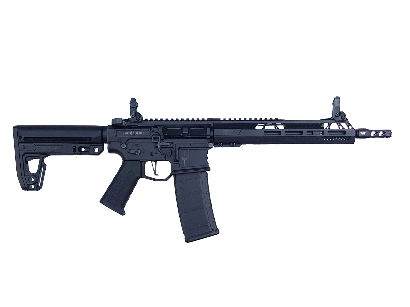 AeroknoxとAscend Armoryという個性的な銃器アクセサリーメーカーのパーツを融合させたAR-15を、 ダブルイーグルがオリジナルデザインでモデルアップ。レシーバーやハンドガードなど複雑な形状はもとより刻印もリアルに再現。 堅牢・軽量なナイロンファイバーをメインパーツとしているため非常に取り回しも良く、高い実射性能も備えたハイポテンシャルライフルとなっています。