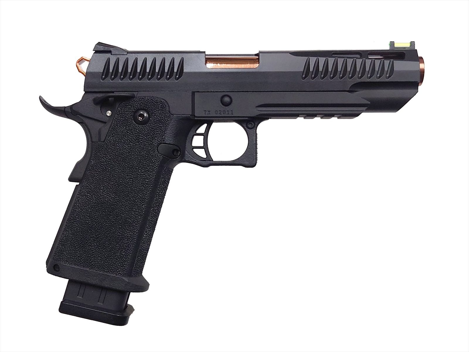 強化樹脂製スライドは大胆なカットでシャープなスタイル、集光アクリルフロントサイトを採用など、ホールド性に優れたテクスチャーグリップ、ホップアップはスライドを外さずにスライドストップで調整、などスタイルと性能を兼ね備えたカスタムモデル。