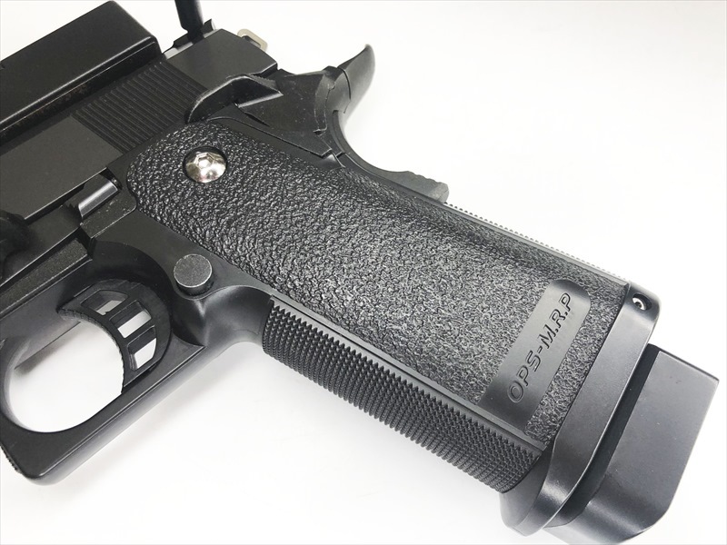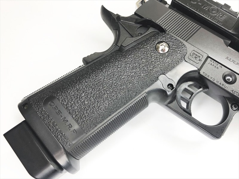 ガバメント唯一の弱点である装弾数の少なさをマガジンのダブルカラム(複列弾倉)化でカバーし、大型のマガジンをすっきりと収納するため、フレームはポリマー(樹脂)製グリップと金属製シャーシを組み合わせたスリムなスタイルとなっています。スライドには重量弾「.45ACPミリタリーボール+P」への対応を想定した角型ヘヴィタイプを採用。また、ピカティニー規格(20mm幅)のアンダーレイルが付属し、各種フラッシュライトを装着可能なタクティカルスタイルと、レイルレスのスポーツスタイルを選択可能なオールマイティモデルとなっています。