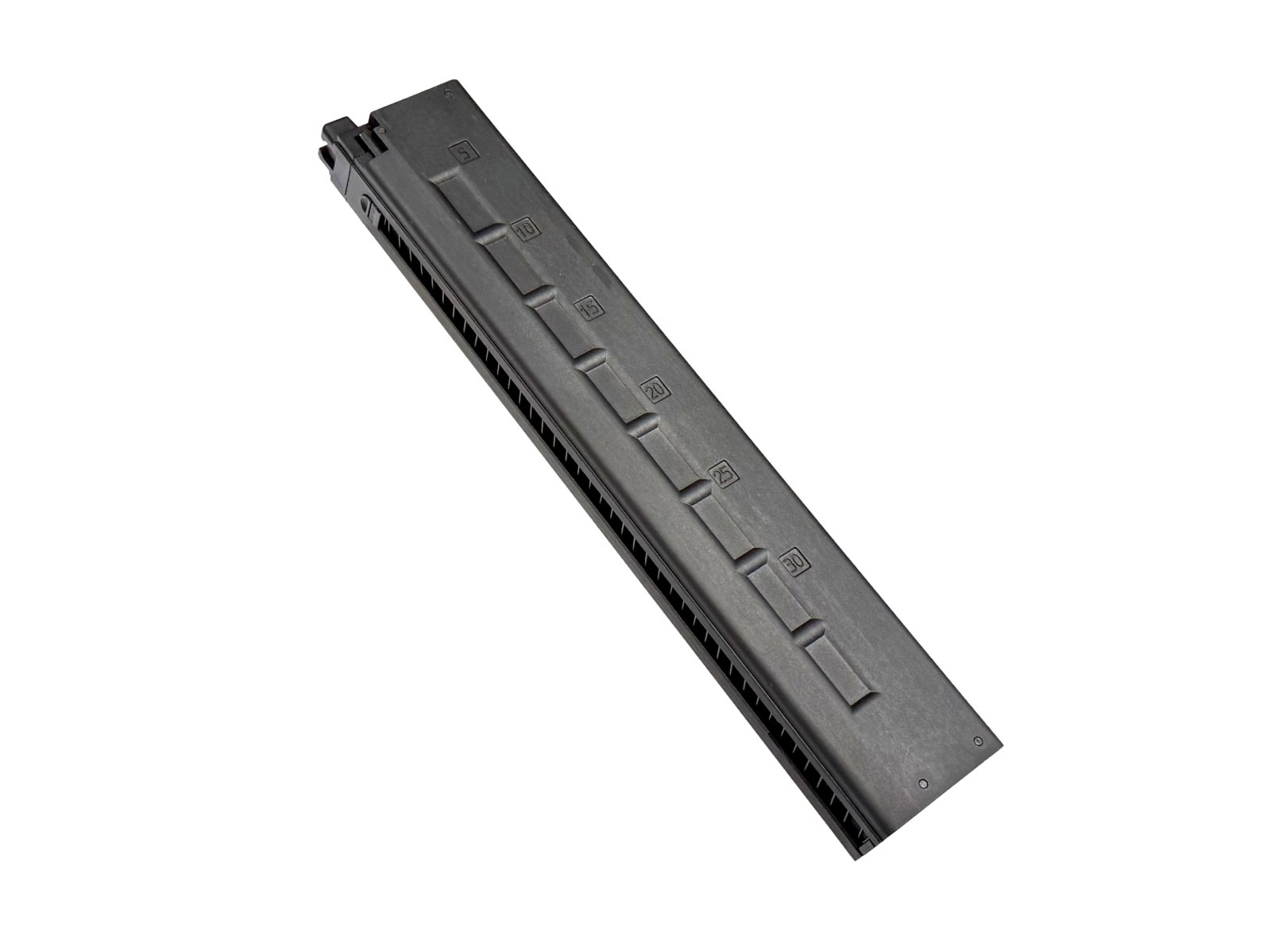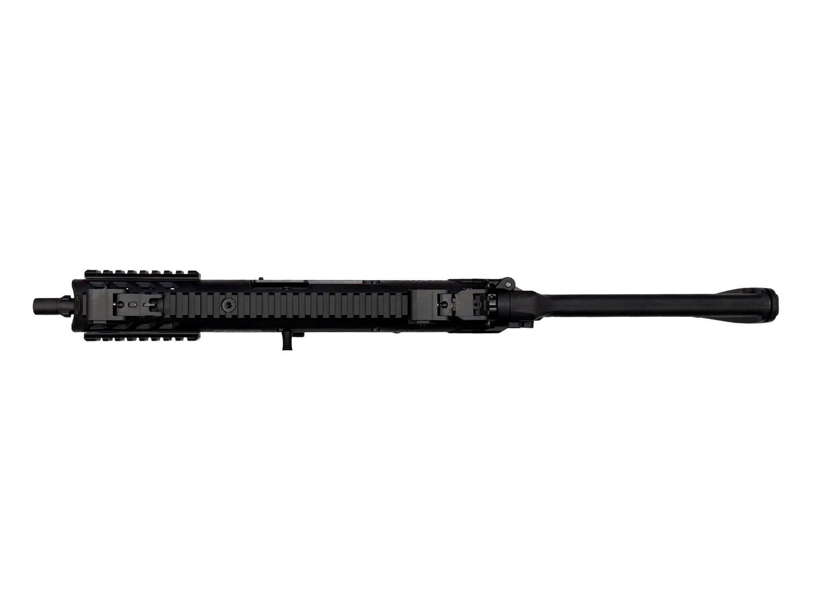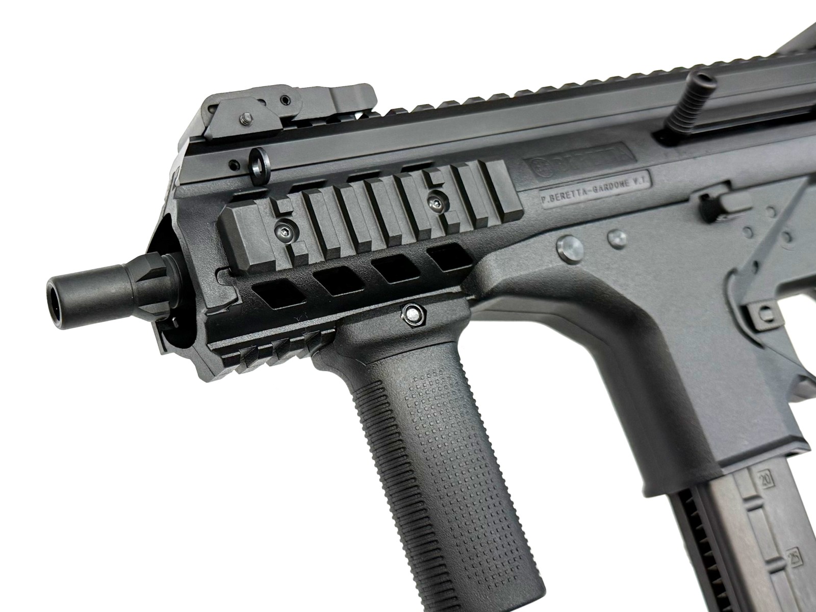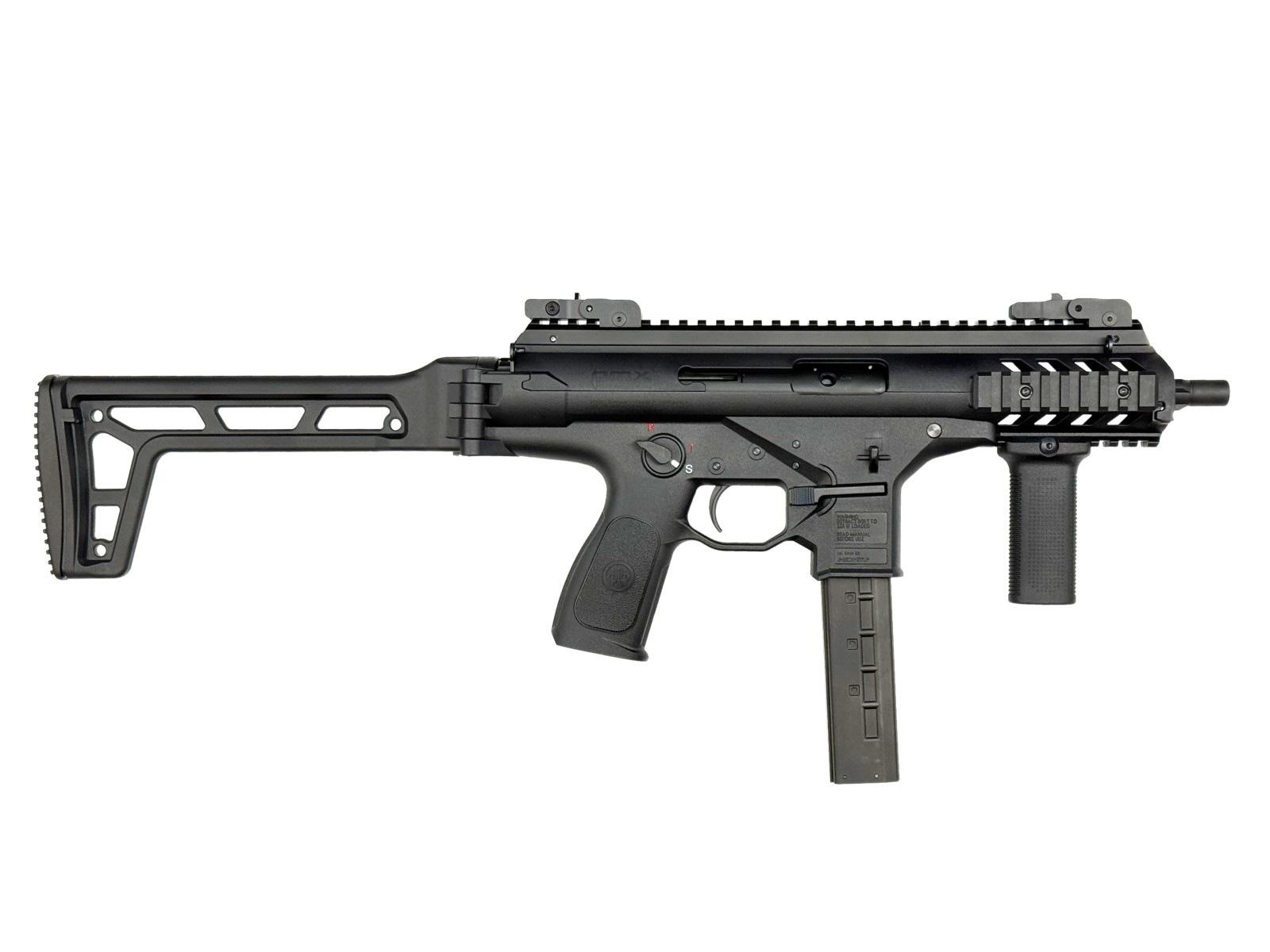イタリア国家治安警察隊カラビニエリが制式採用した最新サブマシンガンPMX。クローズドボルトから始まる発射サイクルは、その機能上高集弾性能を生み出し、ポリマー素材を多用したことで軽量化にも成功しています。この最新SMGが、KSCから『システム7 TWO』エンジン搭載のガスブローバックで登場。大型ダイアル式ホップアップ。ピカティニーレイルをアッパー、左右、ロワーに配し、前後の可倒式サイトは上下左右調整可能で、さらに倒した状態で3点ダットサイトの役目も果たします。マガジンキャッチ、セレクターは左右両側から操作可能、チャージングハンドルを右に付けても折りたたんだストックは作動の邪魔をしません。このように多数の特徴を持つPMX。KSCの自信作です。
