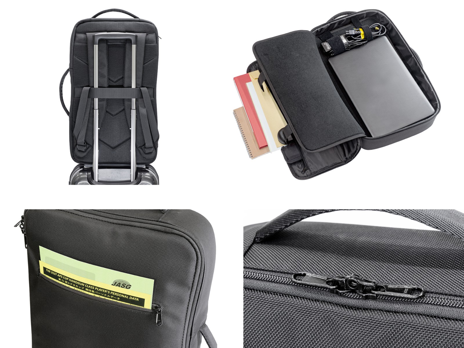 競技用としての高い機能性に加え、ビジネスバッグとしても使える洗練されたデザインを兼備。生地には、耐久性・防水性に優れた「ナイロン1680D PUコーティング」を施し、アクティブな移動にも耐えうる堅牢性を実現しました。背面およびハーネス部分には通気性の高いメッシュ素材を採用し、長時間背負っても蒸れにくく、夏場でも快適です。サイドには手持ちに便利なハンドルを配置し、移動時にはブリーフケースのように持ち運ぶことも可能。また、スーツケースのハンドルに通せるセットアップベルトも搭載しており、出張や遠征時にもスムーズな移動をサポートします。内部の収納には、APS-1 グランドマスター以外にもAPS-3を2丁同時に収納可能。競技用エアースポーツガンを安全かつスマートに収納できる設計です。また、一部CA870シリーズ※の収納にも対応しています。さらにフロントポケットには、APSカップや公式競技会で使用するパーソナルデータなどの書類が収納可能です。ビジネスシーンにも対応する収納力と機能性を備えています。