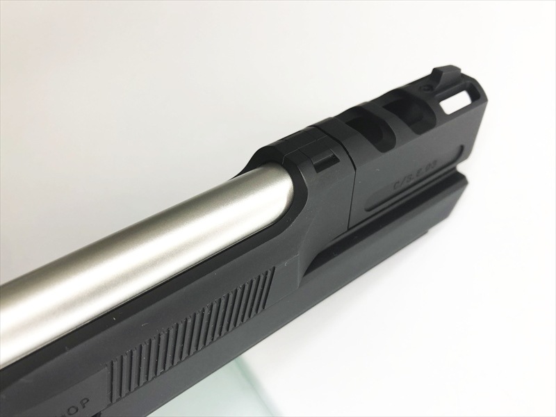 そしてその強烈な反動をコントロールするための《ピカティニー規格マウントレイル付スタビライザー》と、《4ポーテッド・コンペンセイター》が標準装備されている。また、弾頭の拡大による装弾数の減少に対してはマガジンのロング化で対応している。さらにグリップにおいても、質感の異なるラバー素材を組合せる事により、最高のホールド性を可能とした。