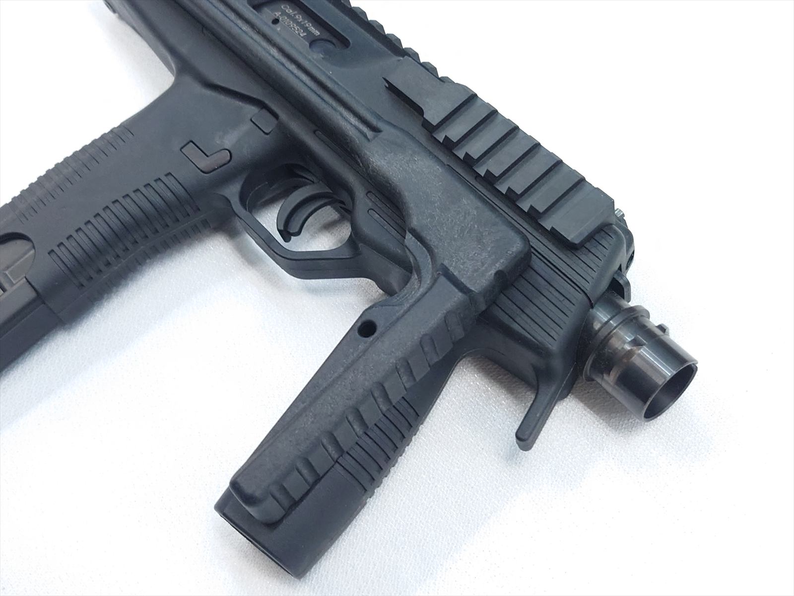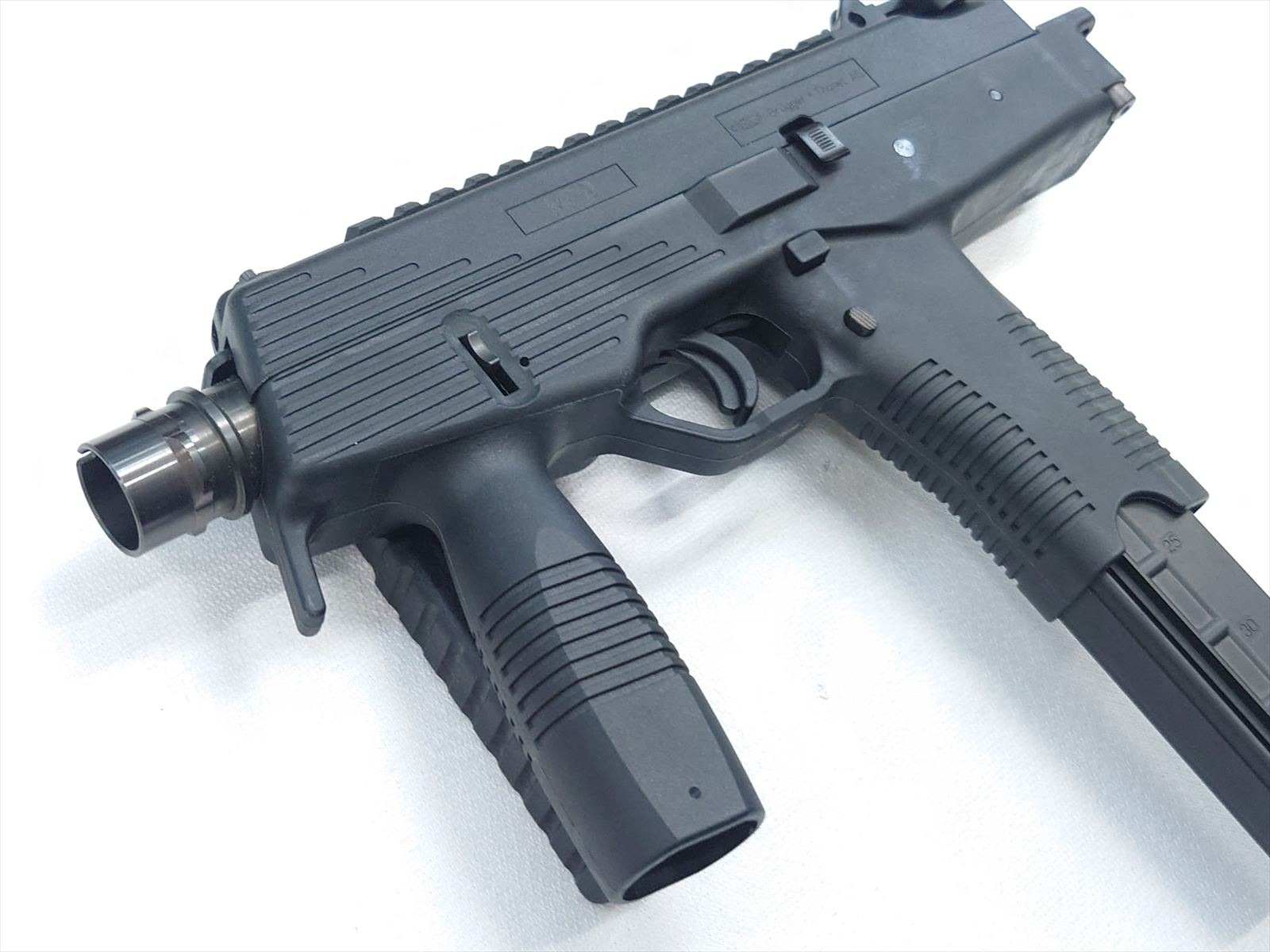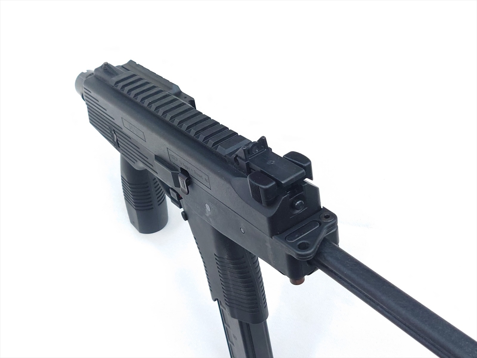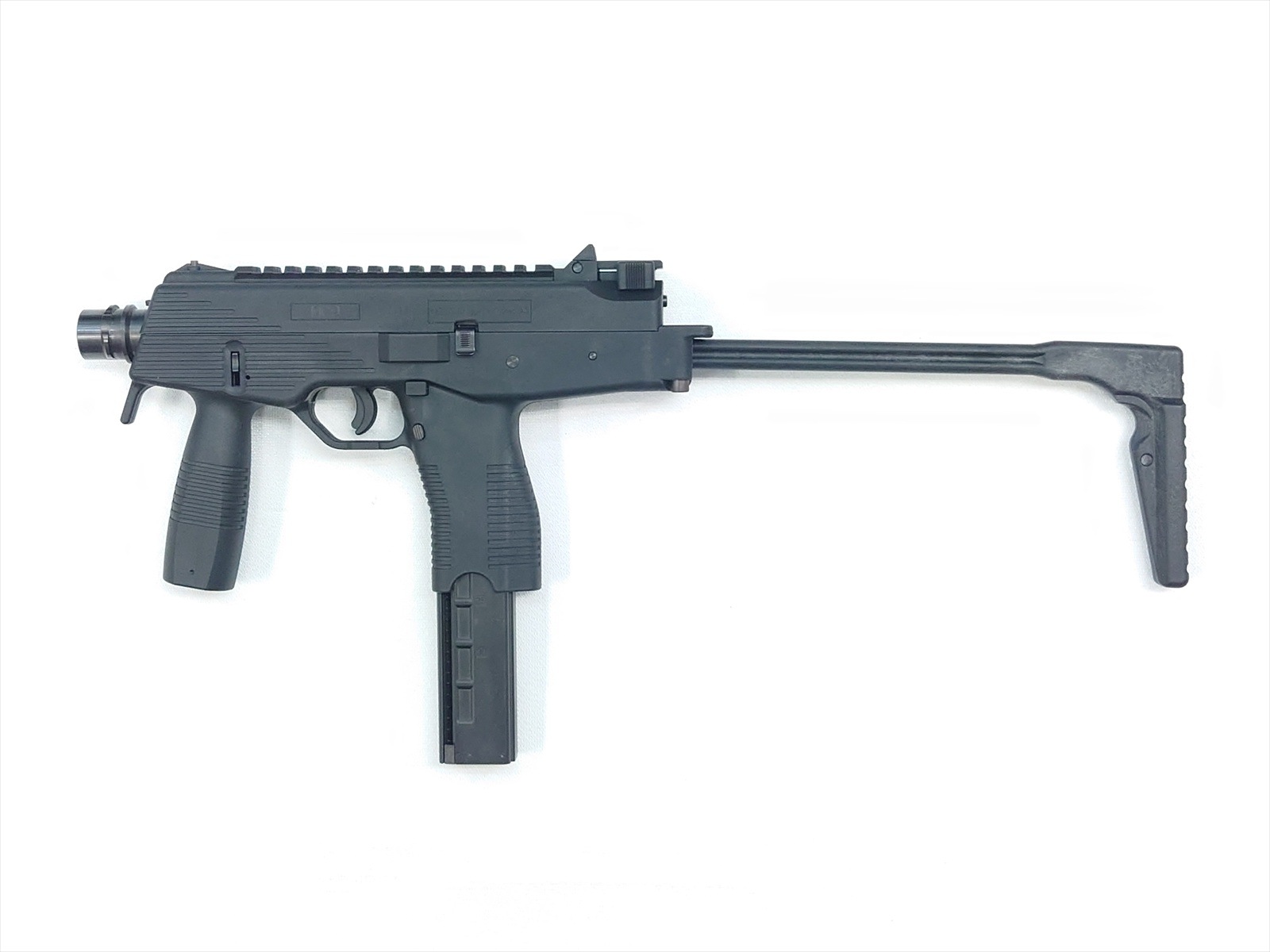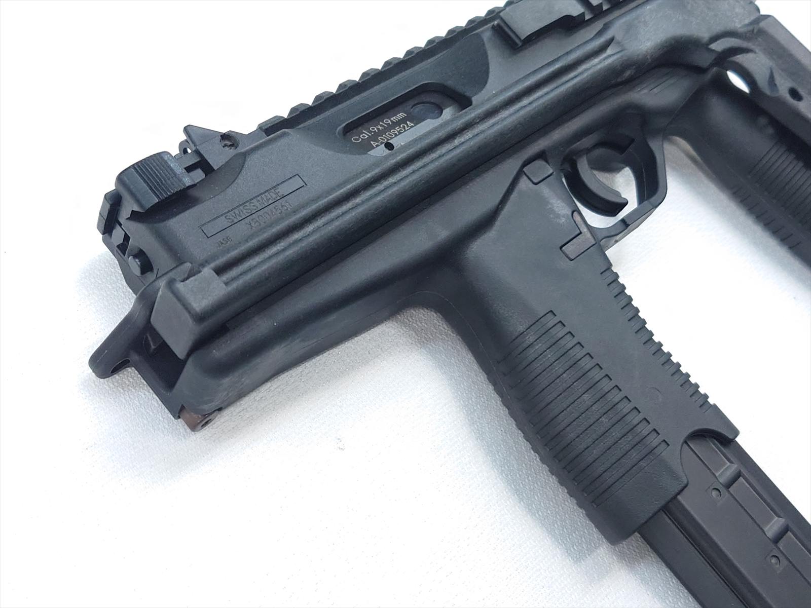 スイスにある軍警察/特殊部隊関連のメーカーにより、実戦的な改良が施されたTMPシリーズの後継機がこのモデル。瞬時に展開できるスイング・ストックをコンパクトに装備し、超ローマウントのスコープレイルとサイドのピカティニーレイルのコンボ・スタイルが迫力の機能美を完成させました。
